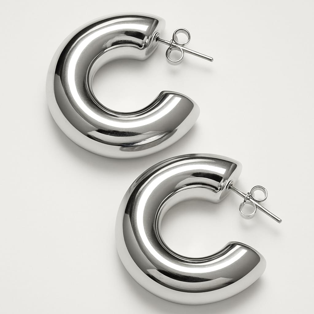 Kolczyki ze stali nierdzewnej, srebrne o minimalistycznym, wyrazistym designie. Ich zaokrąglony kształt typu 'C' pięknie odbija światło, dodając elegancji każdej stylizacji. Idealne zarówno na co dzień, jak i na specjalne okazje. Zapinane na sztyft.