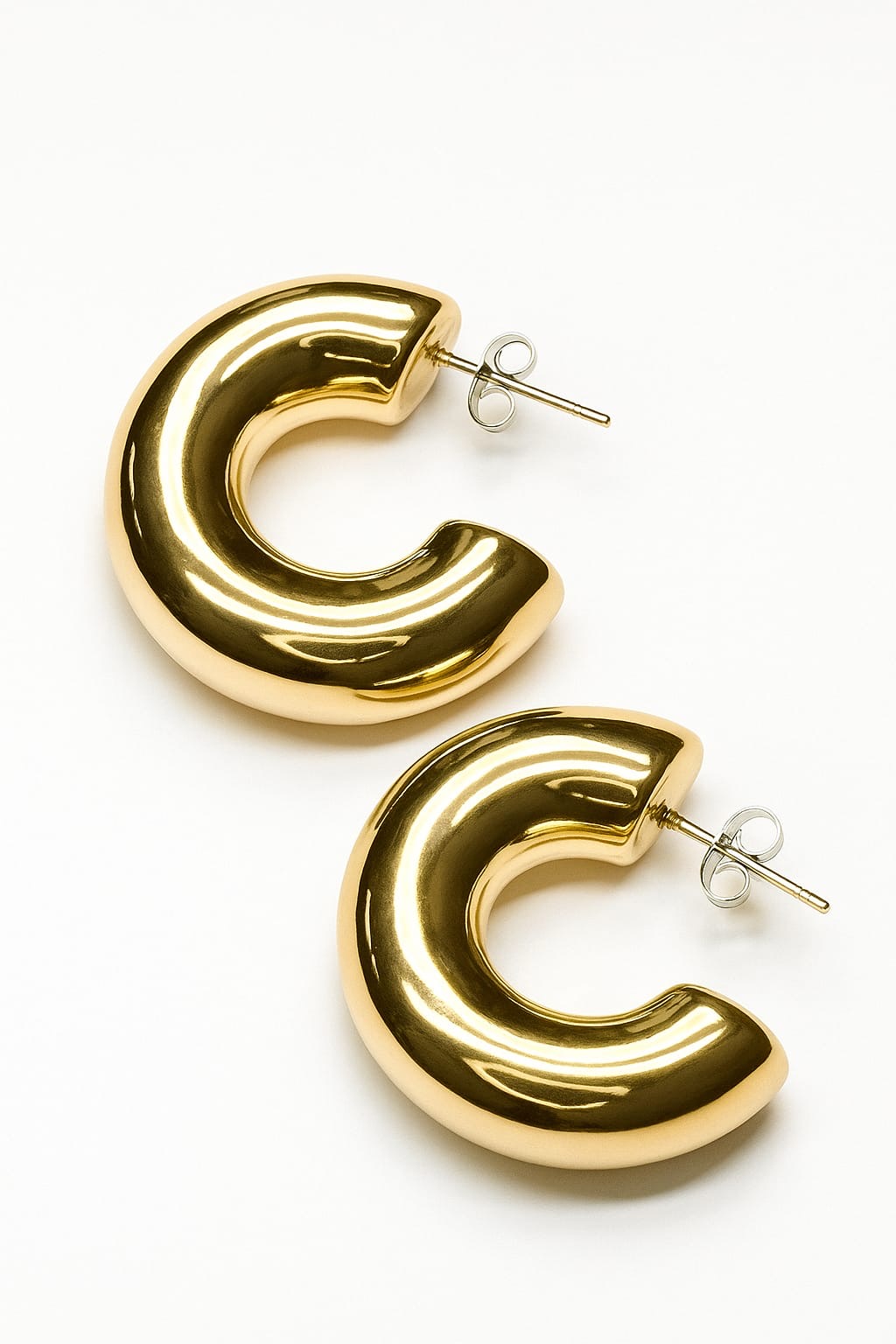 Kolczyki ze stali nierdzewnej, złote o minimalistycznym, wyrazistym designie. Ich zaokrąglony kształt typu 'C' pięknie odbija światło, dodając elegancji każdej stylizacji. Idealne zarówno na co dzień, jak i na specjalne okazje. Zapinane na sztyft.