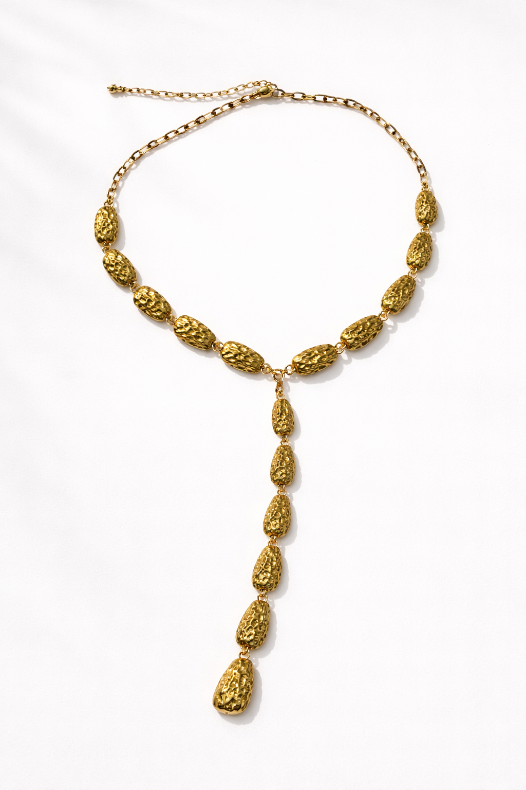 Budapeszt to naszyjnik, który pracuje z kobiecym ciałem. Jego miękka, organiczna forma i delikatnie wydłużona linia w kształcie litery Y naturalnie podkreślają dekolt, prowadząc wzrok w dół w niezwykle zmysłowy, ale subtelny sposób.