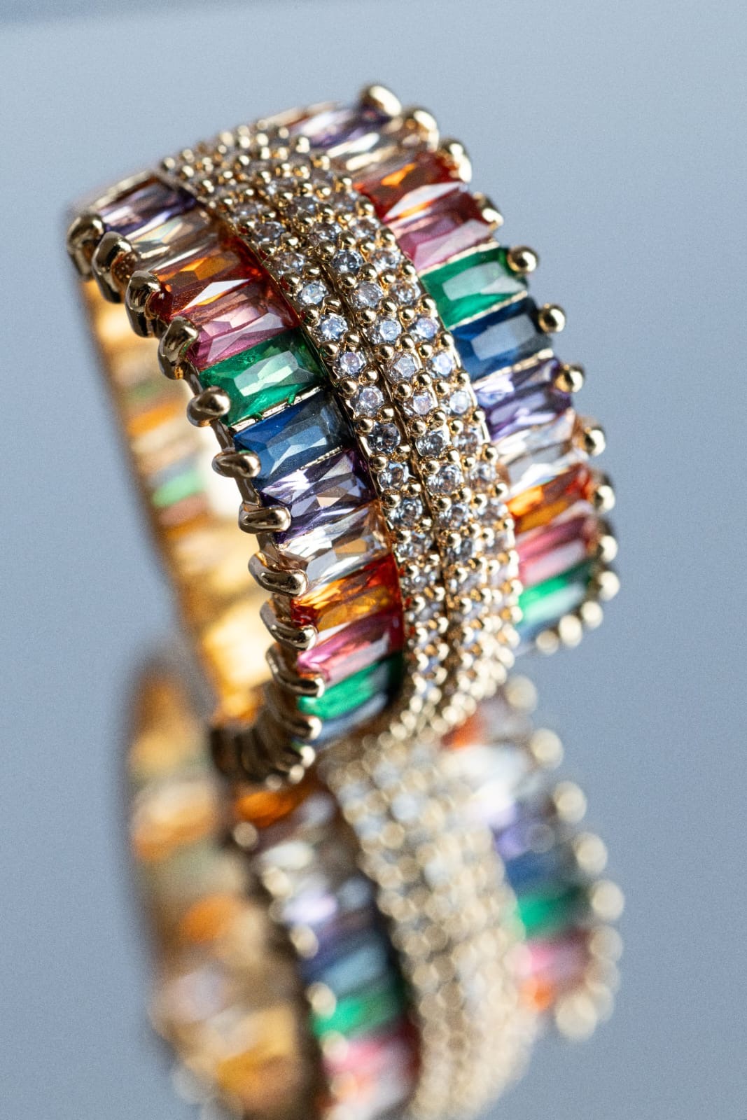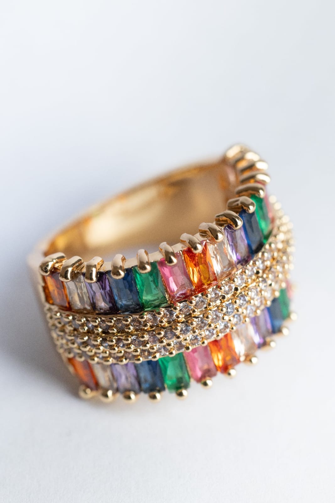 Pierścionek Barbados, regulowany, typu obrączka. Stal nierdzewna, z potrójnym rzędem kamieni, kryształów. Niezwykle elegancki i wyrafinowany.