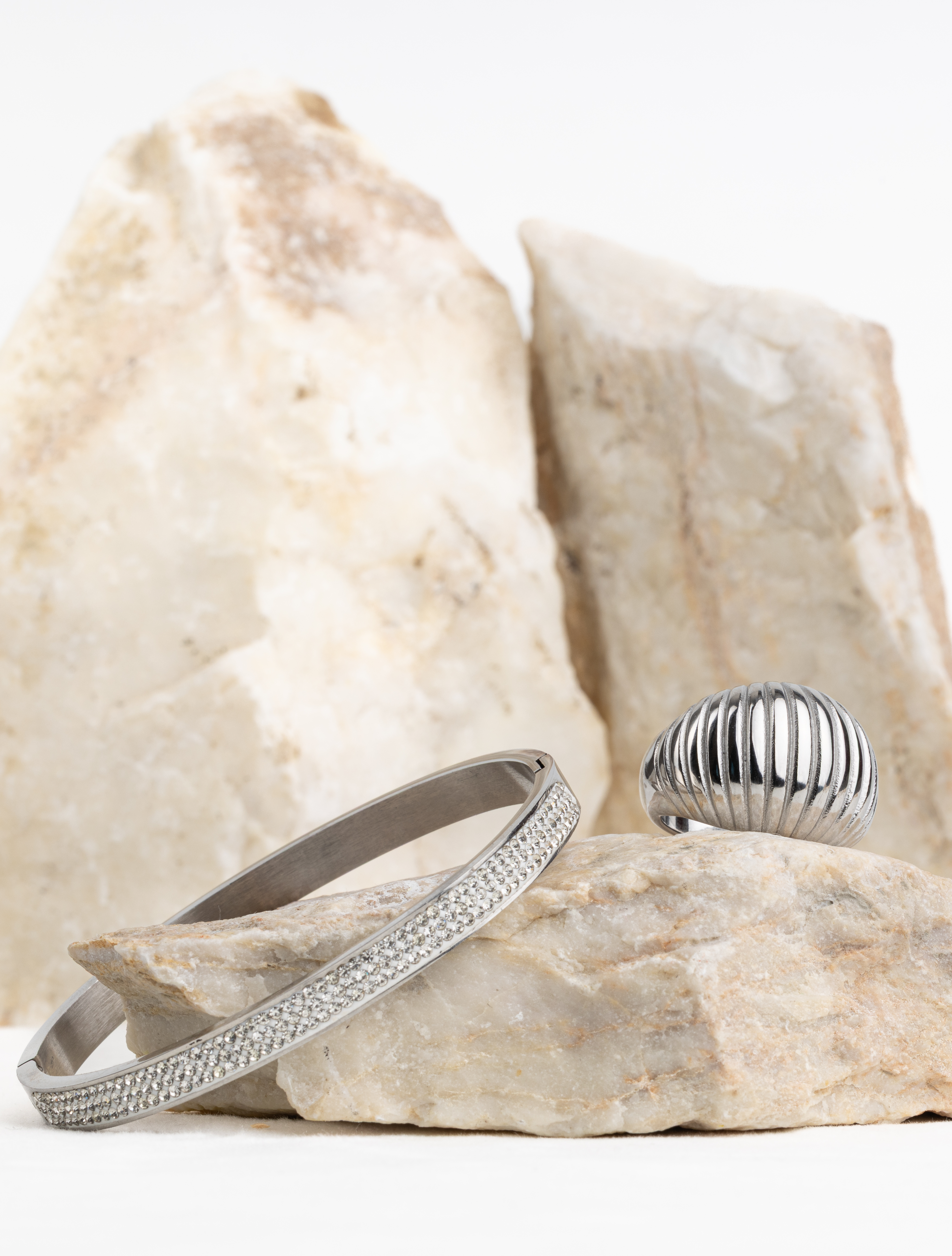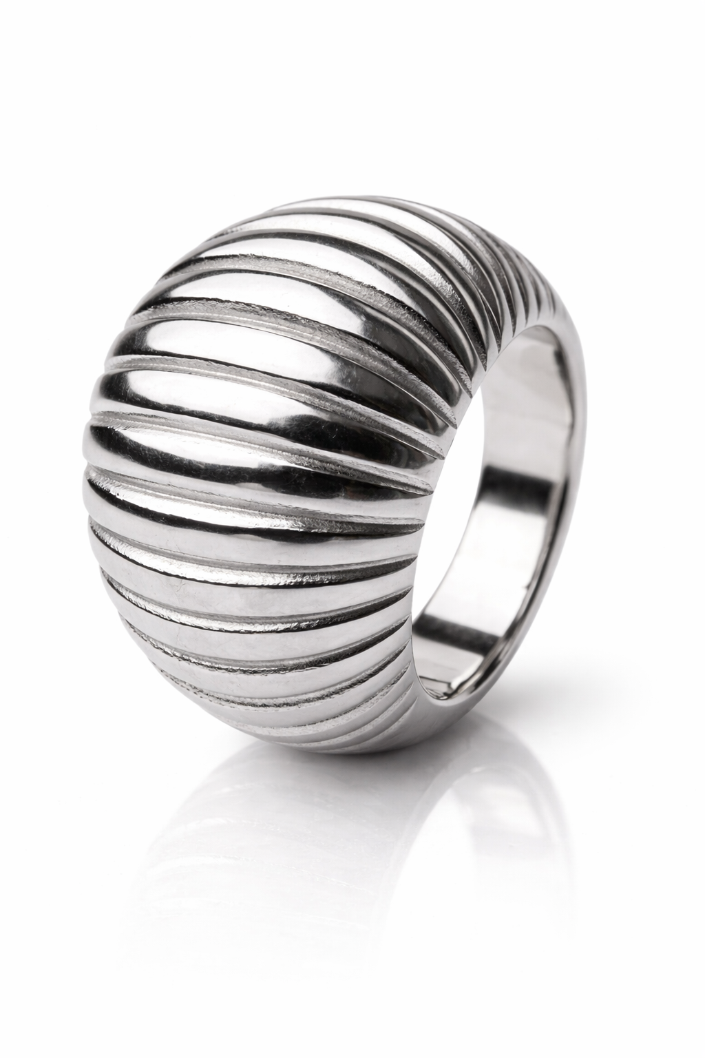 Stylowy pierścionek ze stali nierdzewnej, posrebrzany z piękna kopułą.