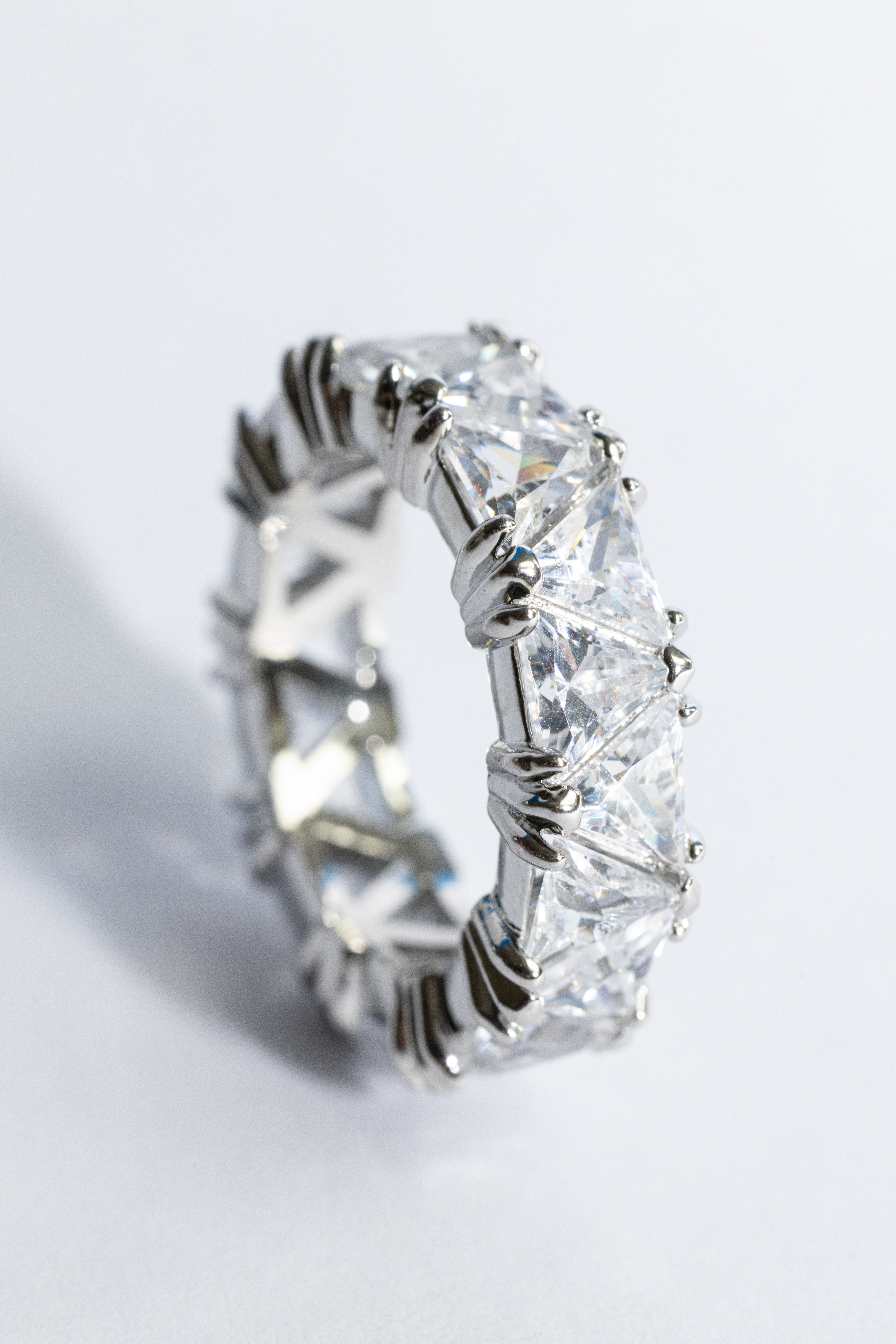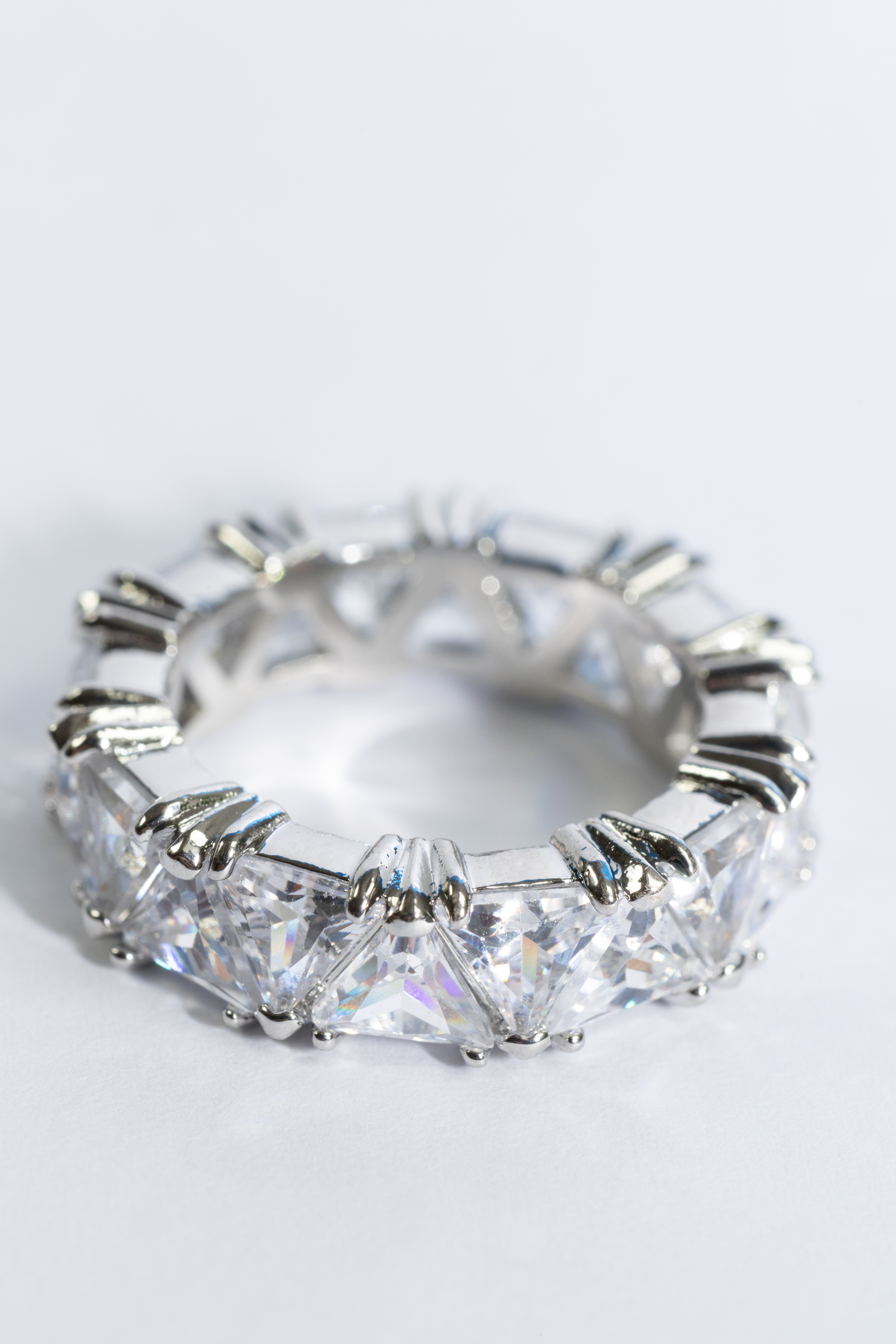 Pierścionek Panama, typu obrączka. Ze stali nierdzewnej, z białymi kamieniami. Bardzo elegancki i wytworny. Rozmiar 6.